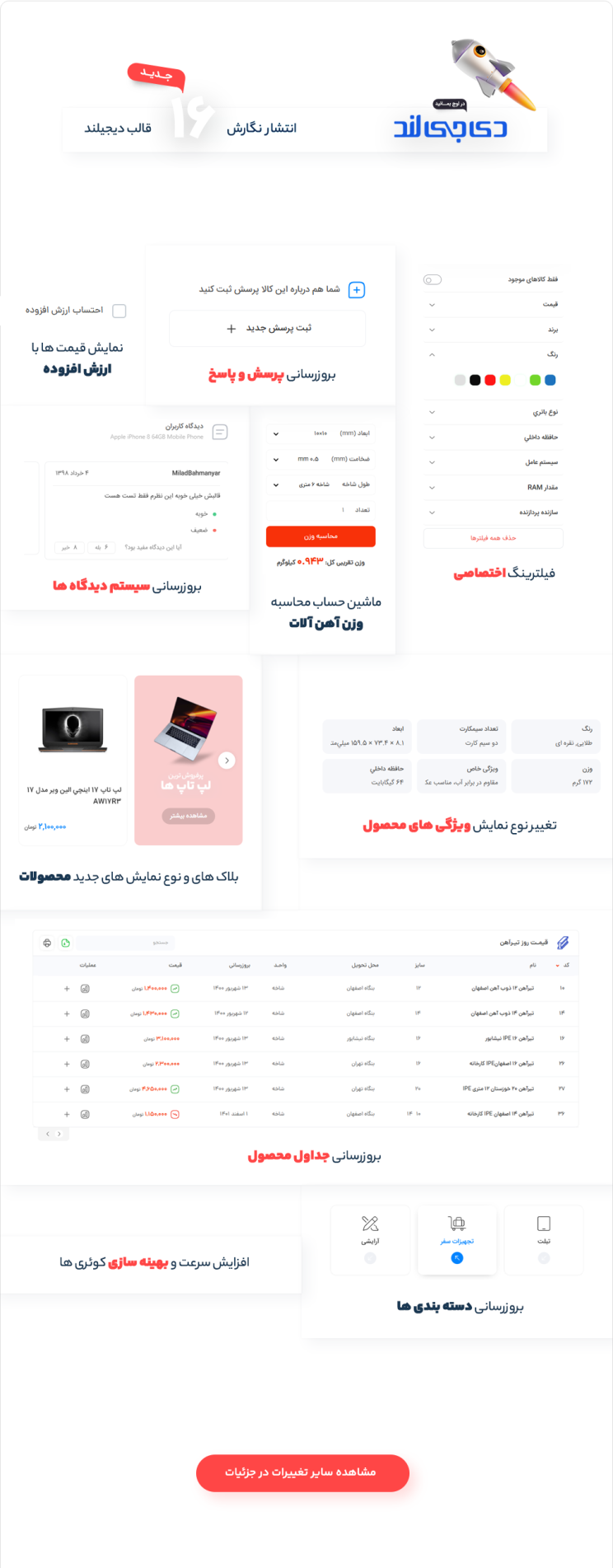 همچنین از نقاط قوت قالب دی جی لند که باعث شده در این سال ها دائما در صدر قالب های فروشگاهی قرار گیرد میتوان به ارائه آپدیت های منظم و پشتیبانی قدرتمند این محصول اشاره کرد.